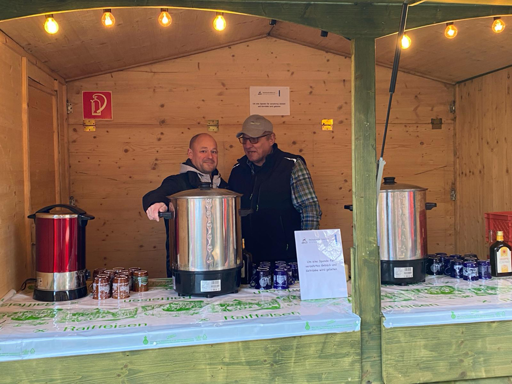 Zum späten Nachmittag wurde dann auch Glühwein angeboten. Auch hier folgten zahlreiche Besucherinnen und Besucher der Einladung zum gemütlichen Plausch am Glühweinstand. Eine Gruppe Männer aus den Reihen des Vorstands hatte die Hütte bereits am Vormittag publikumswirksam an der Ecke Harrierstraße/Overbergstraße aufgestellt, so dass sich später auch etliche Frauen und Männer am Stand niederließen, die zuvor die Karnevalsfeier des RKV im RekenForum besucht hatten.